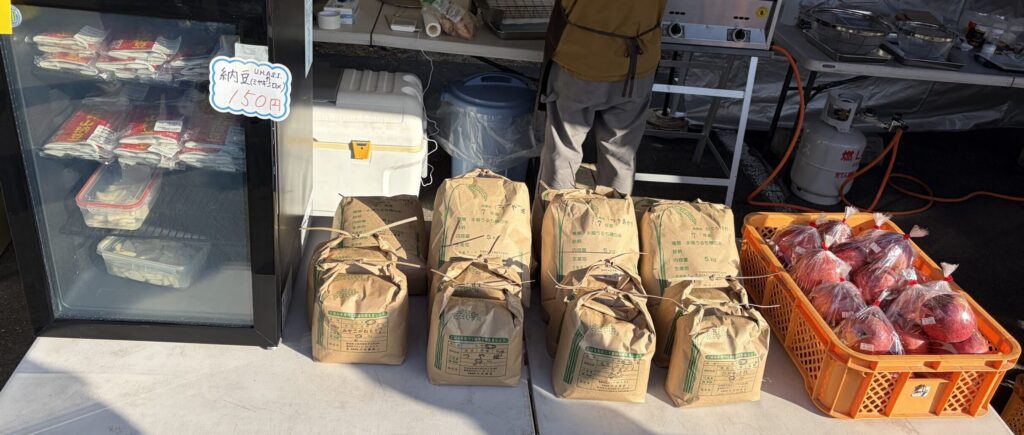 当日は多くの皆さまに足を運んでいただき、自社栽培の野菜やお米(精米)をはじめ、当社生産大豆を使用した雷神山納豆、そして仕入れたリンゴを販売しておりました。